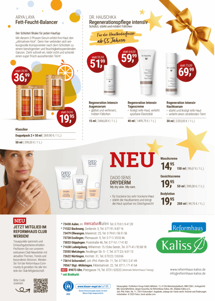 Wenn die Haut in der Kälte spannt, schenken Naturkosmetikmarken wie Annemarie Börlind, Arya Laya, Dado Sensoder Dr. Hauschka wohltuende Feuchtigkeit und neue Strahlkraft. Ob sanft regenerierend, intensiv pflegend oder duftend verwöhnend – hier findet jede Haut ihr Lieblingsritual.