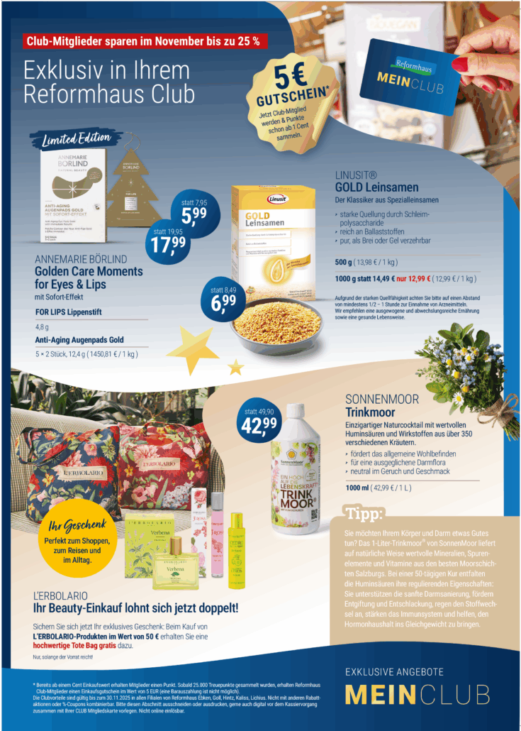 Wer regelmäßig im Reformhaus Kaliss einkauft, sollte unbedingt Mitglied im Reformhaus Club werden. Mitglieder sammeln Punkte, profitieren von Sonderaktionen, erhalten Einkaufsgutscheine und erfahren als Erste von neuen Angeboten.