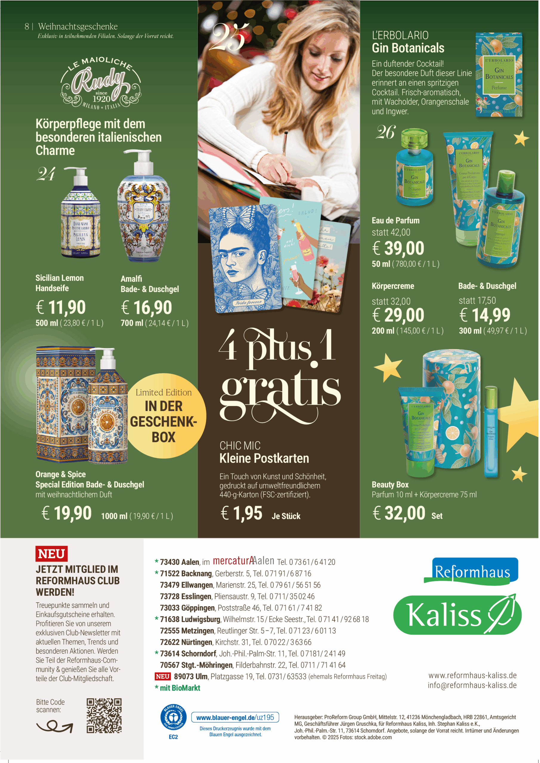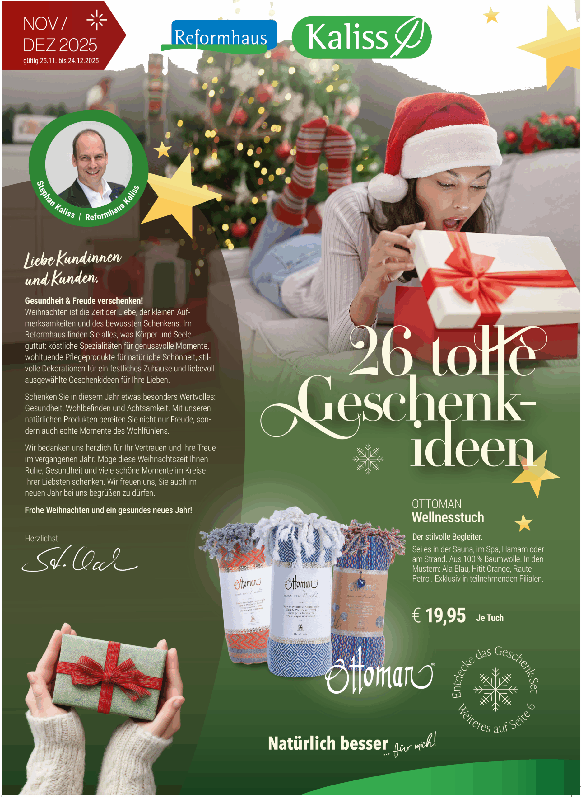Wenn Sie auf der Suche nach sinnvollen, schönen und natürlichen Geschenkideen sind, lädt Sie das Reformhaus Kaliss ein, sich inspirieren zu lassen. Ob Wellness, Genuss, Duft, Wärme oder Pflege – bei uns finden Sie das passende Präsent für Ihre Liebsten und natürlich auch für sich selbst.