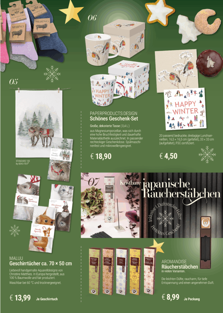 Auch die stilvollen Magnesiumporzellan-Tassen und schönen Geschirrtücher im Aquarell-Stil sorgen für weihnachtliche Akzente in jedem Zuhause.