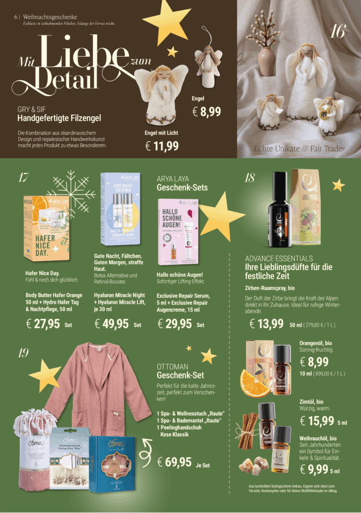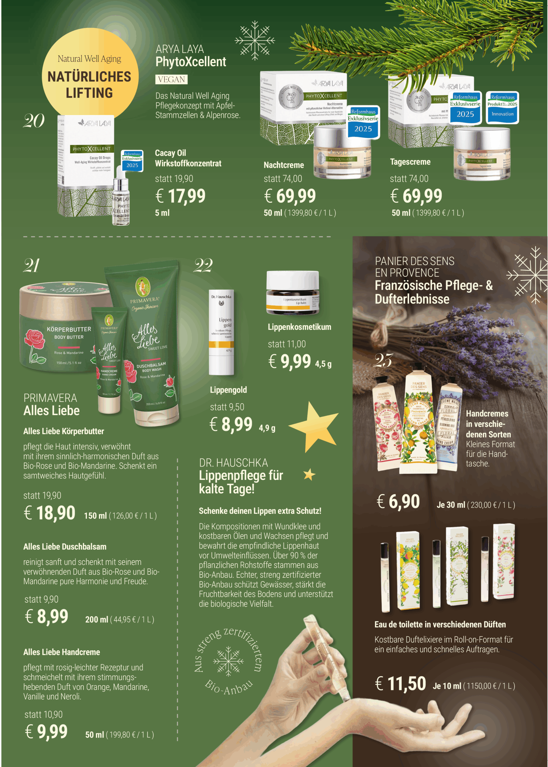 Unser Winterspecial bietet Ihnen 26 ausgewählte Geschenkideen, die Körper und Seele in der kalten Jahreszeit verwöhnen. Freuen Sie sich auf hochwertige Naturprodukte, köstliche Spezialitäten und kleine Wohlfühlmomente, die sich perfekt unter dem Weihnachtsbaum machen.