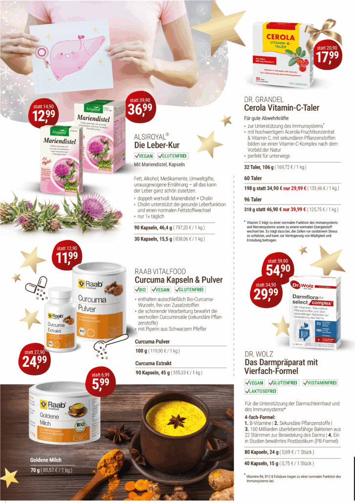 Der Dezember lädt uns ein, Körper und Seele Gutes zu tun. Deshalb finden Sie in allen Reformhaus-Kaliss-Filialen auch in diesem Jahr eine stimmungsvolle Auswahl an winterlichen Aktionsangeboten. Für Ihre Gesundheit stehen bewährte Begleiter im Mittelpunkt: die hochwertigen Mikronährstoff-Kombinationen von Dr. Wolz, die natürlichen Cerola Vitamin-C-Taler oder die über 75 Pflanzenessenzen von One Essence. Sie schenken Energie, stärken das Immunsystem und bringen Leichtigkeit in die dunklen Wintertage. Ergänzt wird dies durch basische Produkte von P. Jentschura, alkoholfreie Bitterstoffe aus Bio-Kräutern sowie wohltuende Curcuma-Spezialitäten – ideal für alle, die sich im Jahresendtrubel etwas Gutes tun möchten.